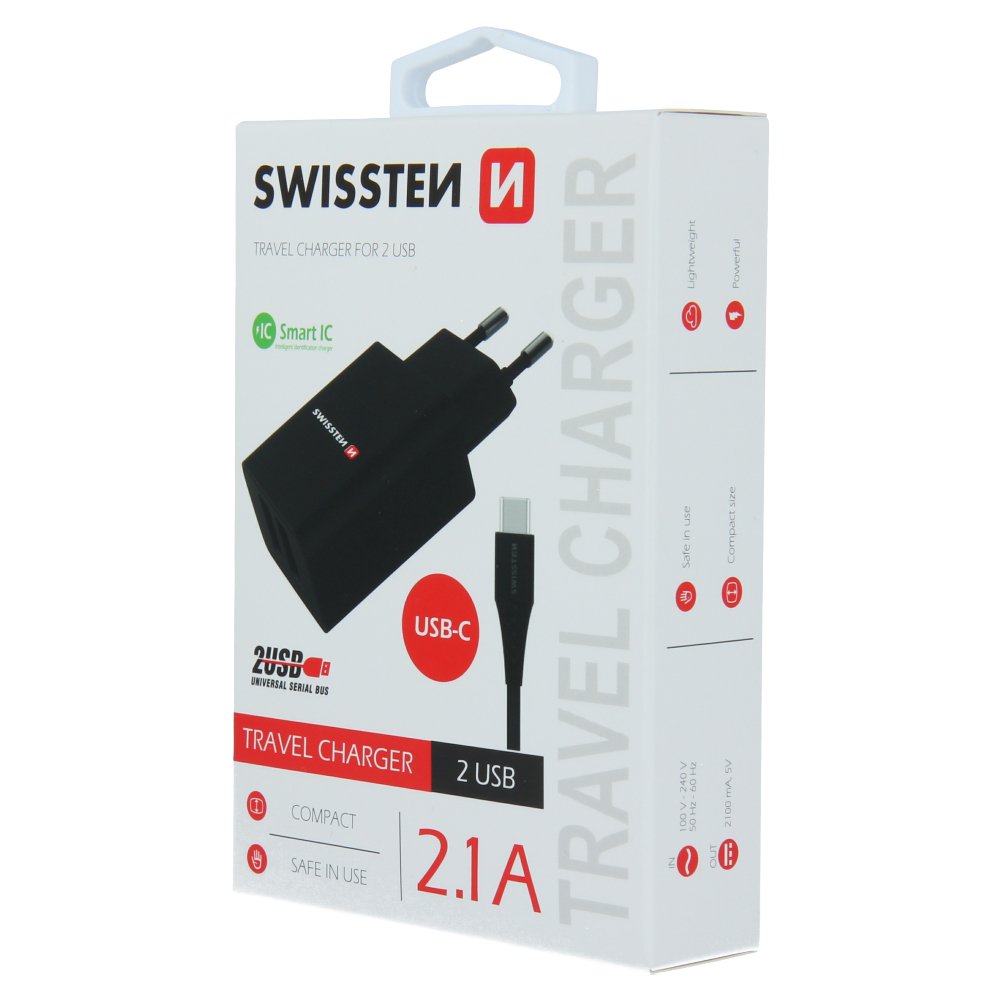 SWISSTEN CHARGER SMART IC – 2x USB 2,1 A POWER BLACK + DATA CABLE SWISSTEN USB / TYPE C 1,2 M BLACK